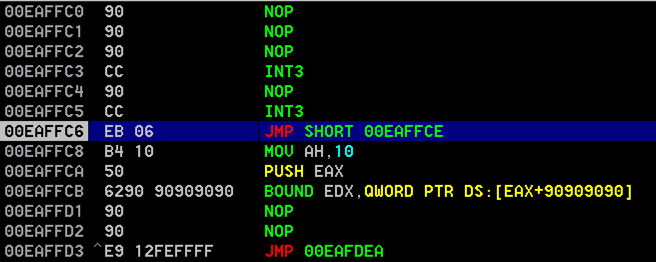 And when the exception occurs, that should start executing code 4 bytes before the SEH, so we'll put 3 NOPS and a "\xCC" bytes there, which will cause an INT3, which we can see in the debugger.