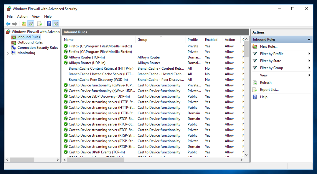 In the "Windows Firewall with Advanced Security" window, the left pane, click "Inbound Rules", as shown below.