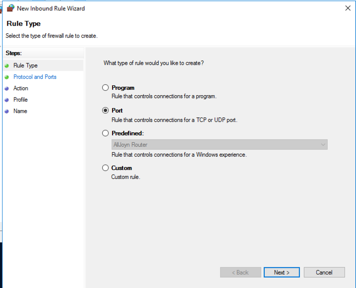 In the "New Inbound Rule Wizard" window, on the "Rule Type" page, click Port, as shown below. Then click Next.