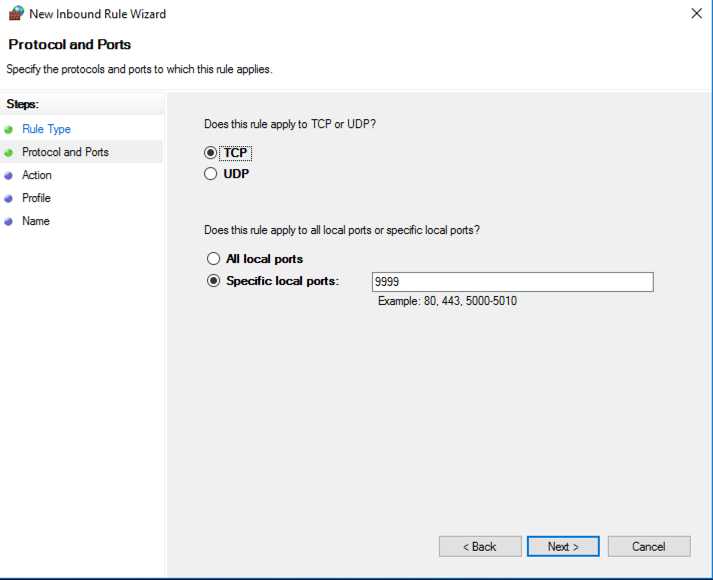 On the "Protocols and Ports" page, click "Specific local ports" and enter 9999 as shown below. Then click Next.