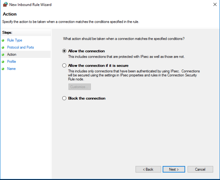 On the "Acton" page, accept the idefault selection of "Allow the connection", as shown below. Then click Next.