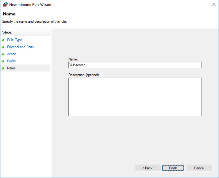 On the "Name" page, enter a name of Vulnserver, as shown below. Then click Finish.