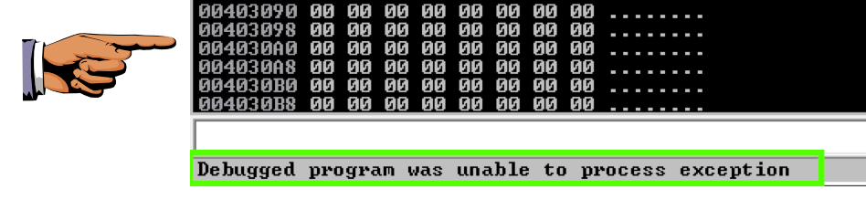 The exploit now fails. Immunity shows this message: "Debugged program was unable to process exception", as shown below.