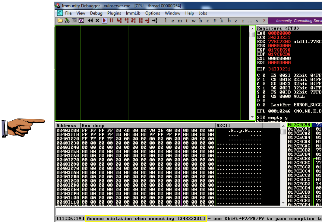 Press Shift+F9. (If you are using VMware Fusion on a Mac, press Shift+fn+F9.) Now Immunity says "Access violation when executing [4D4D4D4D]", as shown below.