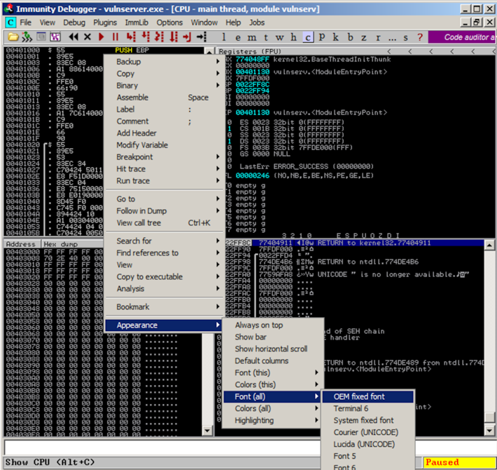 In the lower left pane, scroll up to see the "A" characters we injected. There are hundreds of them. This is a good place to put shellcode.