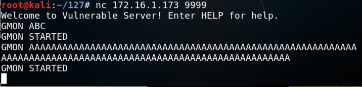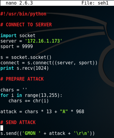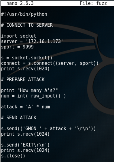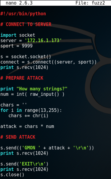 To find the limit of this function's input, we need to write a Python script. On your Kali machine, in the Terminal window, press Ctrl+C to end the connection to "Vulnerable Server".