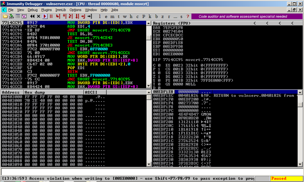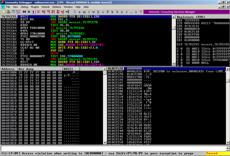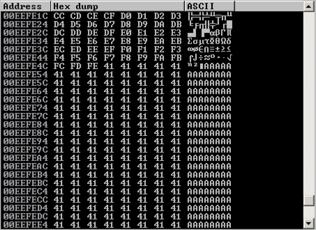 Scrolling up a few lines in the top left pane shows that execution hit the "CC" just after the "A" characters (41), as shown below.