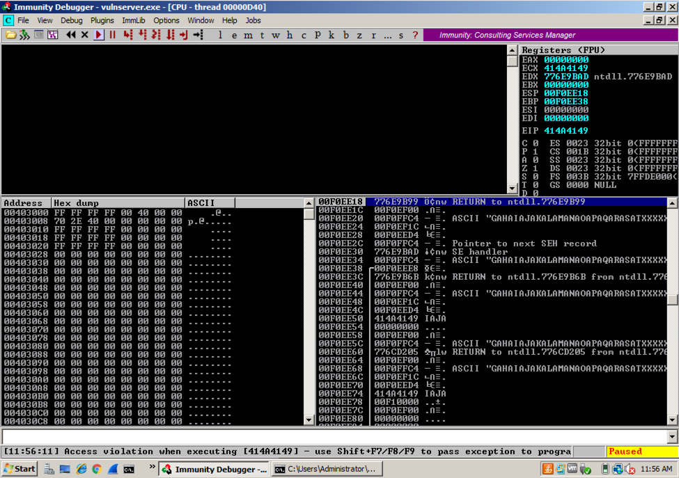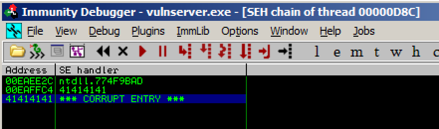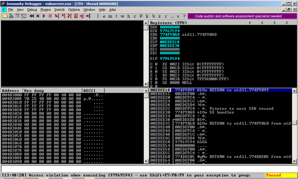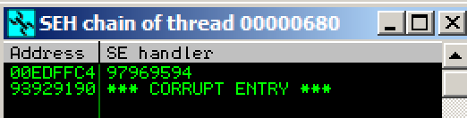 The lower left pane shows the stack--we are nearly at the end of the memory segment. There are only about 50 usable bytes after the SEH bytes--not enough for typical shellcode (330 bytes or so in size).