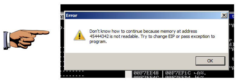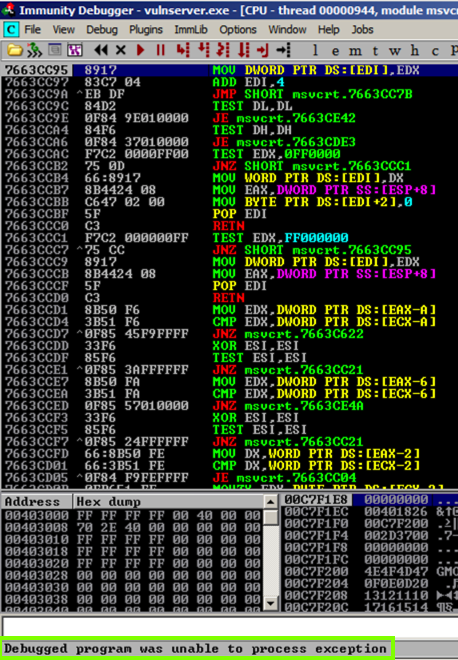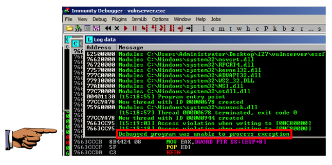 The exploit now fails. Immunity shows this message: "Debugged program was unable to process exception", as shown below.
