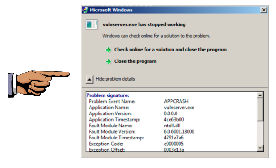 Look at your Windows machine. An error box has popped up, saying "vulnserver.exe has stopped working", as shown below.