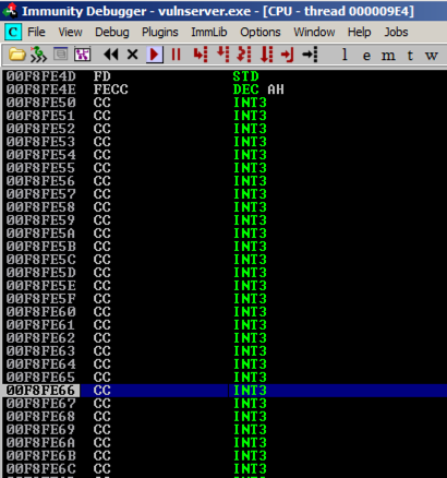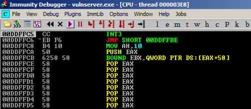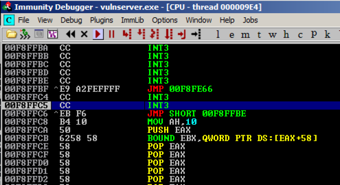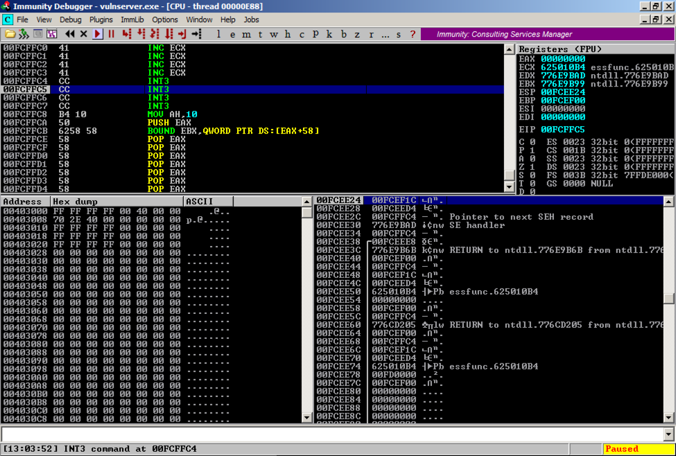 Press Shift+F9. Now Immunity executes the first "CC" and halts, with the message "INT3 command" in the status bar, as shown below.