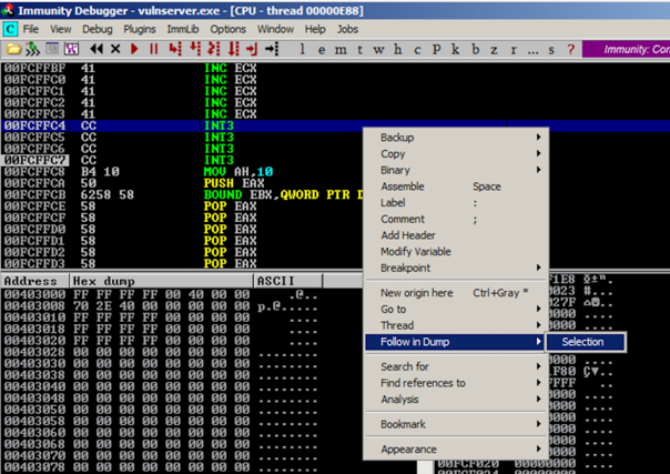 To see it, in the top left pane of Immunity, right-click one of the "INT 3" lines and click "Follow in Dump", Selection, as shown below.