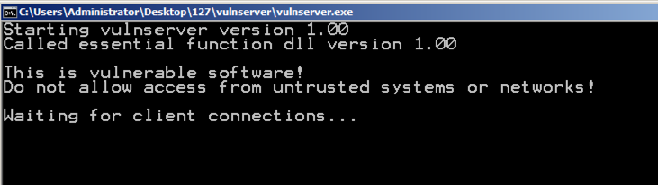 A Command Prompt opens, showing that vulnserver is "Waiting for client connections", as shown below.
