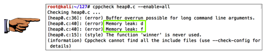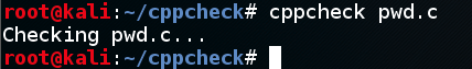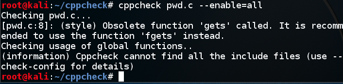 Now cppcheck gives us a generic warning about using gets(), as shown below.cppcheck pwd.c --enable=all