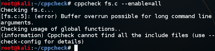 Cppcheck finds the buffer overflow in line 5, but doesn't detect the format string vulnerability at all, as shown below.cppcheck fs.c --enable=all