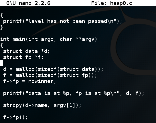 Scroll down to see the vulnerable code, as shown below.curl https://samsclass.info/127/proj/heap0.c > heap0.c nano heap0.c
