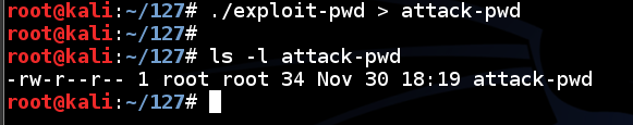 This creates a file named "attack-pwd" containing 34 characters, as shown below../exploit-pwd > attack-pwd ls -l attack-pwd