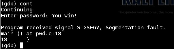 We get the "You Win!" message, as desired. Then, the program crashes because the stack is corrupted and it cannot return normally from main, but that's OK for now.cont