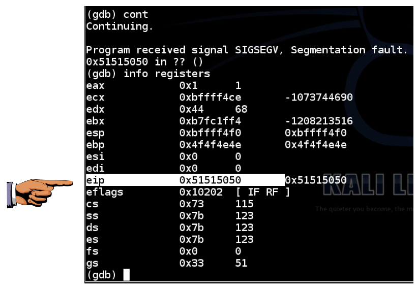 As shown below, the $eip now contains 0x51515050. The 4 characters "PPQQ" end up in $eip.info registers