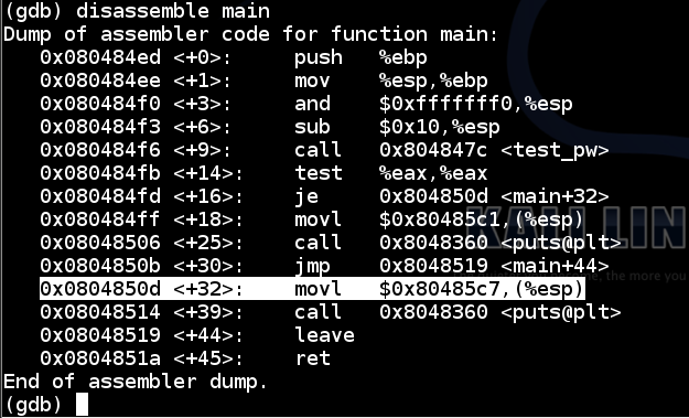 Notice that $eip has an address of <test_pw+25> -- that is, inside the test_pw function.