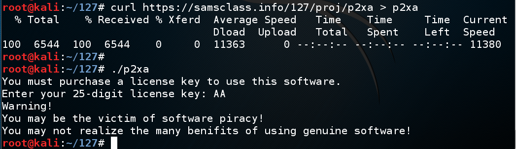 Enter AA as the product key. The key is rejected, as shown below.curl https://samsclass.info/127/proj/p2xa.c > p2xa.c curl https://samsclass.info/127/proj/p2xa > p2xa chmod a+x p2xa ./p2xa