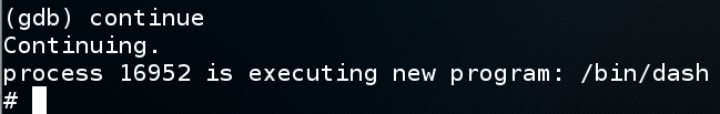 The exploit works, executing a new program "/bin/dash", as shown below.continue