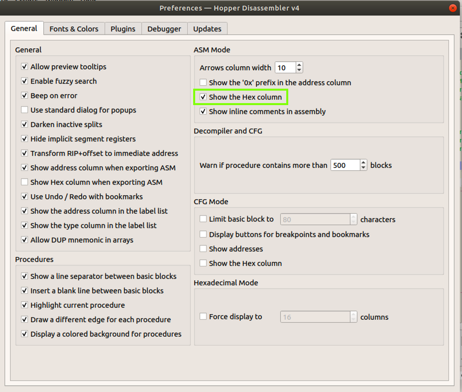 In the Preferences box, on the General tab, in the top right, in the "ASM Mode" pane, click "Show the hex column", as shown below.