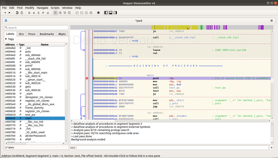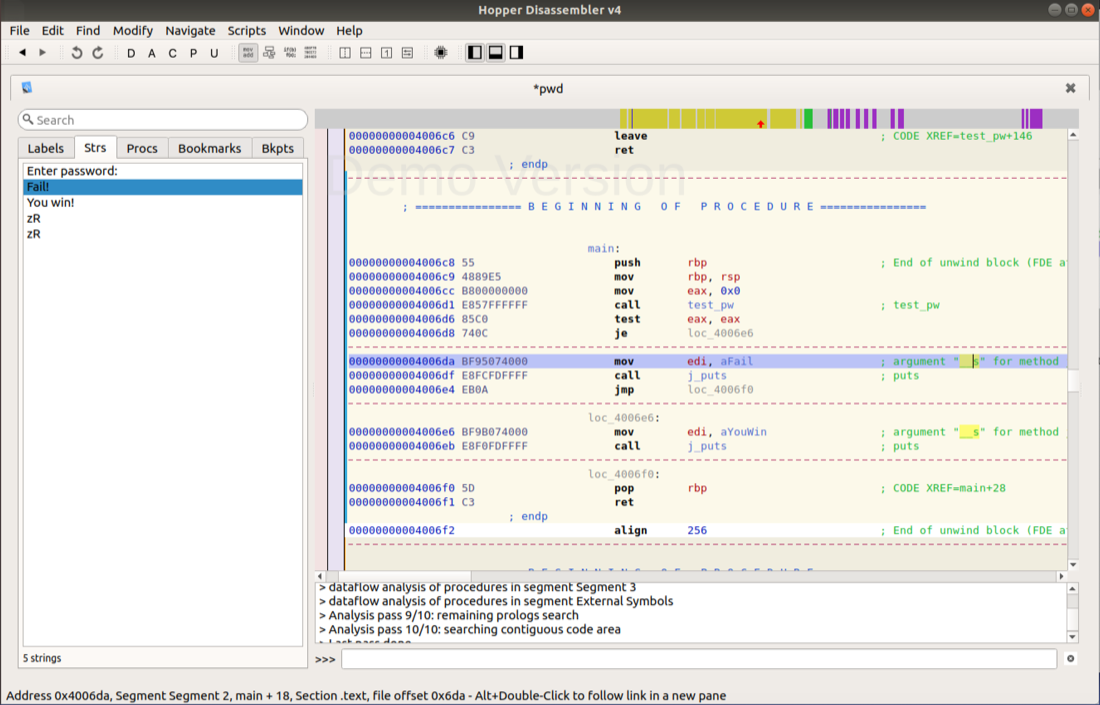In the left pane, click test_pw. The assembly code for the test_pw() routine appears, as shown below.