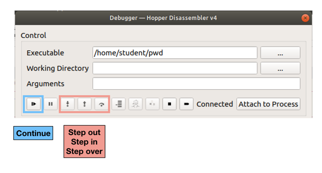 We aren't interested in debugging the C library--we want to debug the C code we wrote. So it doesn't make sense to keep on using "Step in".