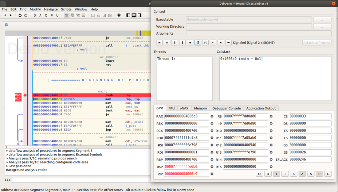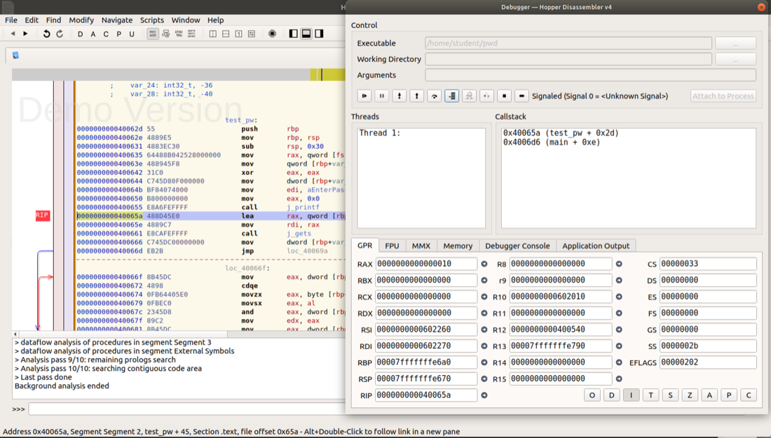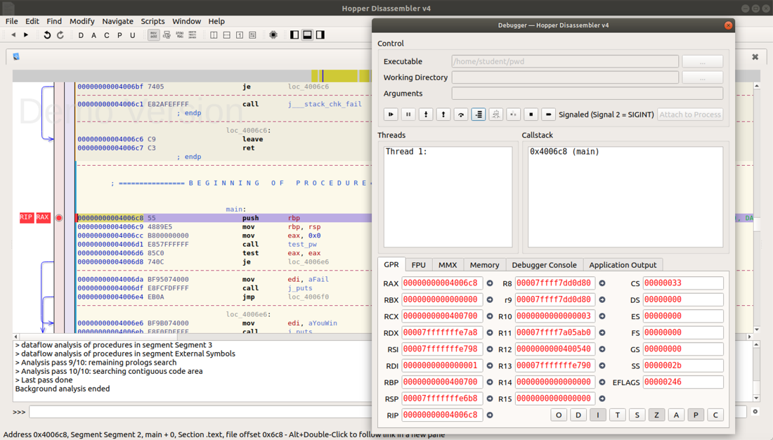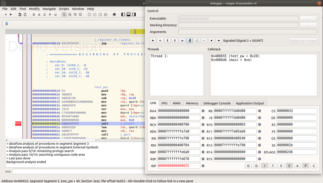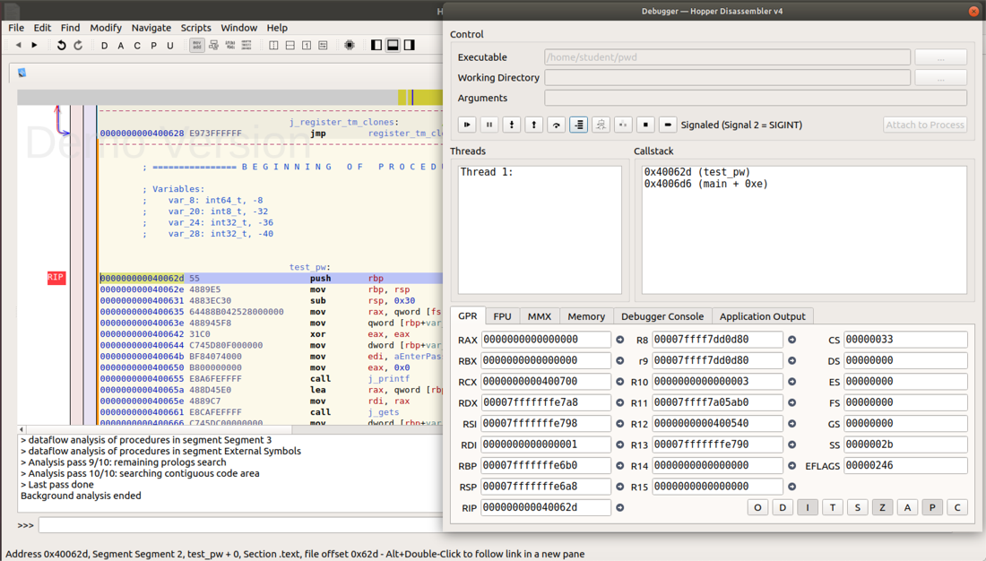 The Disassembler window now shows that RIP is inside the "test_pw" function, as shown below.