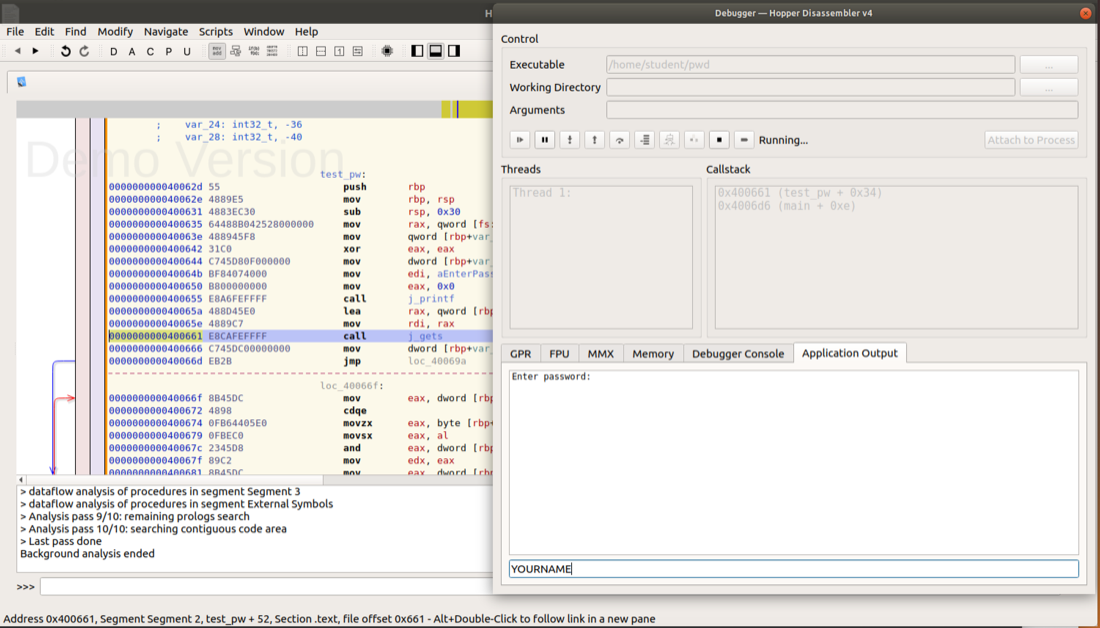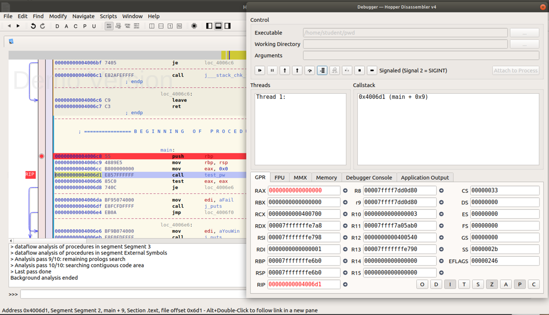The Disassembler window now shows that the RIP is now at the "call test_pw" instruction.