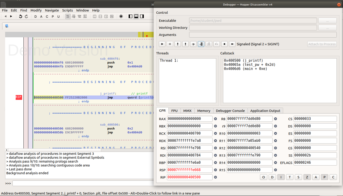 The Disassembler window now shows that we are inside the "j_printf" function.