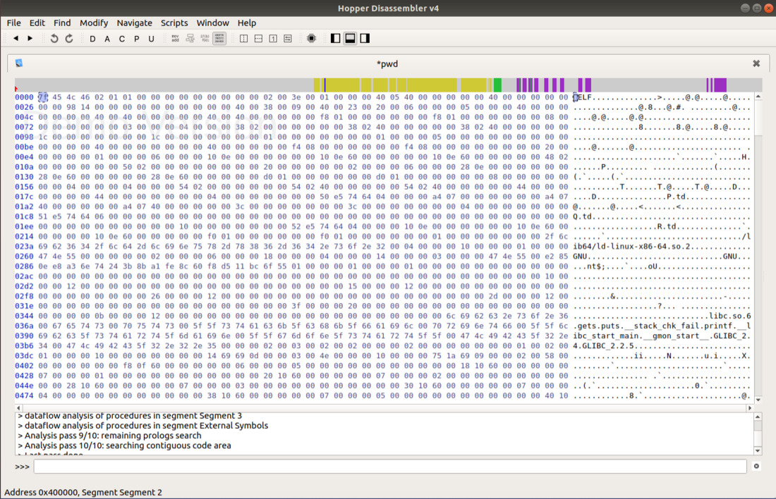 A series of bytes appears, beginning with ".ELF", as shown below.