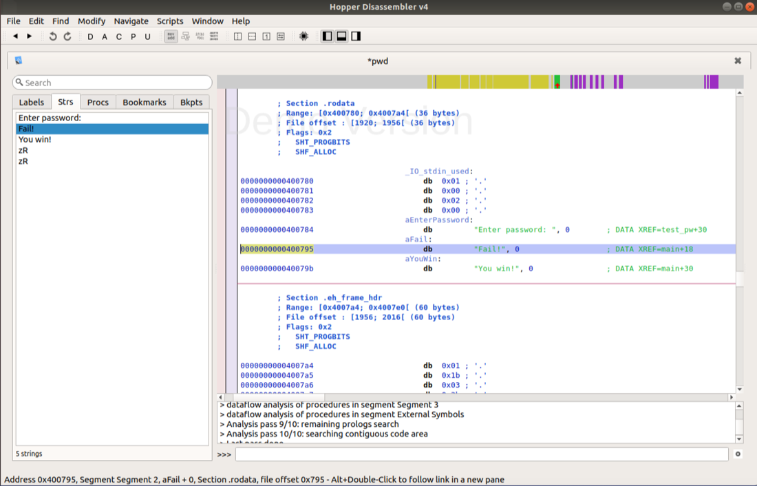 Suppose we want to trick the code into accepting any password, and not printing "Fail!". We'd like to see the code that uses the string "Fail!".