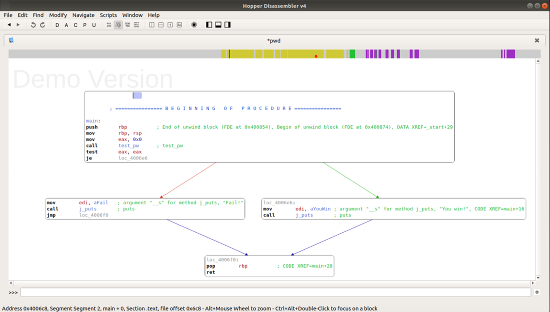 Now the assembly code is easier to understand. Starting at address 4006d1, the code calls test_pw. It then uses test to see if the return value is zero. If it is, it jumps to location 4006e6 and prints "You Win!". Otherwise it doesn't jump, and prints "Fail!".