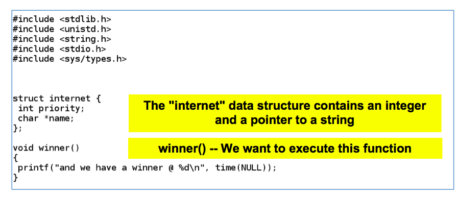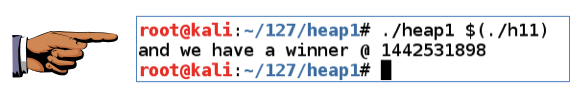 You should see the "and we have a winner" message, as shown below.chmod a+x h11 ./heap1 $(./h11)