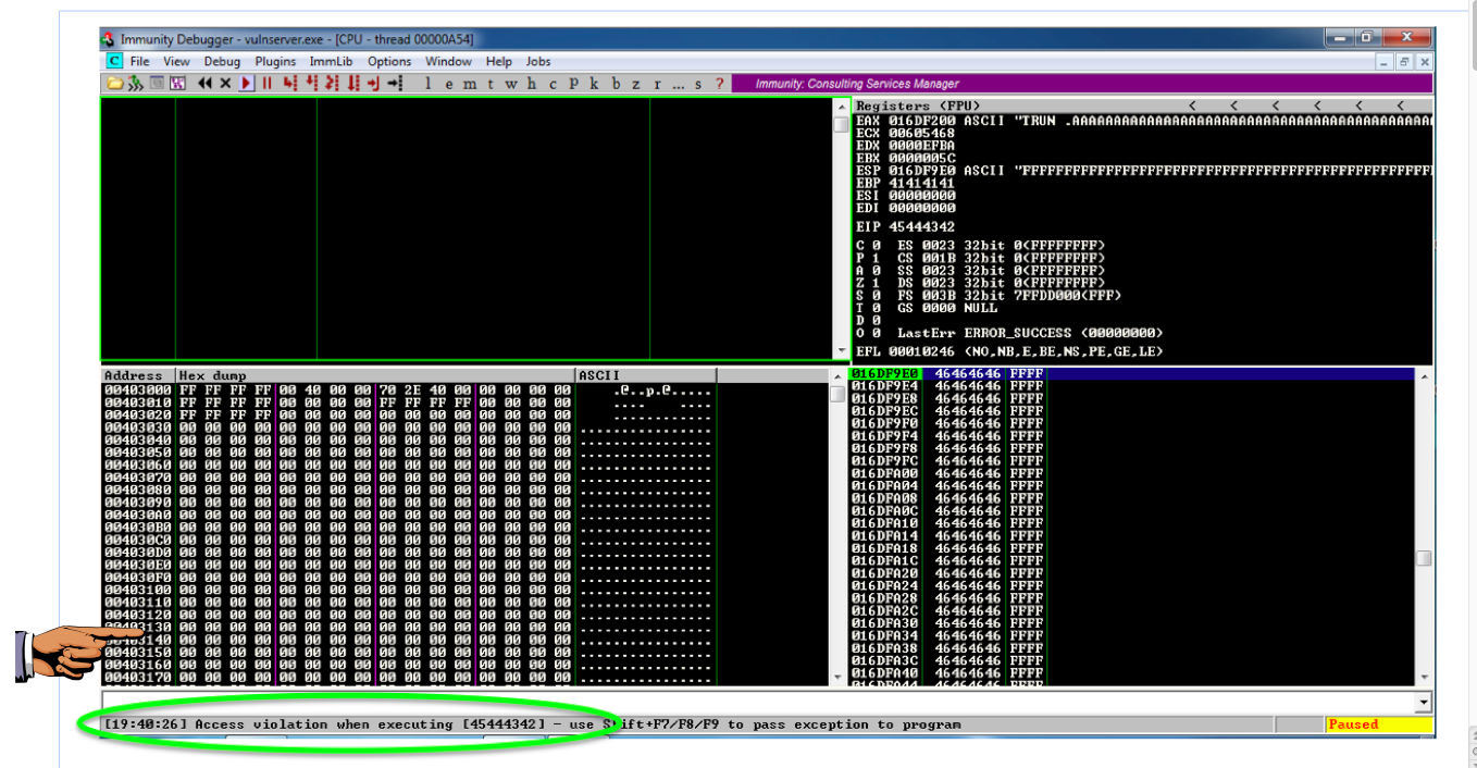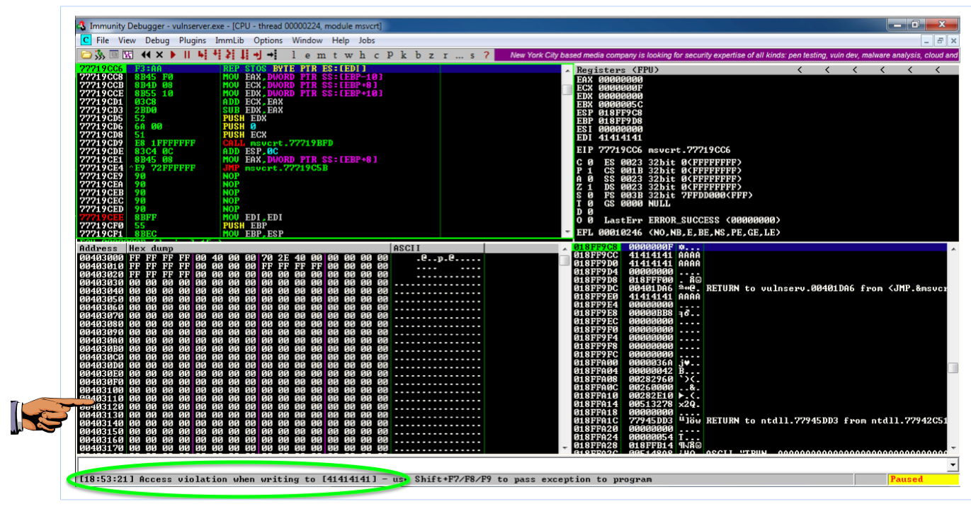 On your Windows machine, in the Immunity window, at the lower left, you see "Access violation when writing to [41414141]", as shown below.