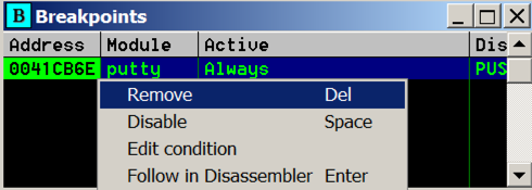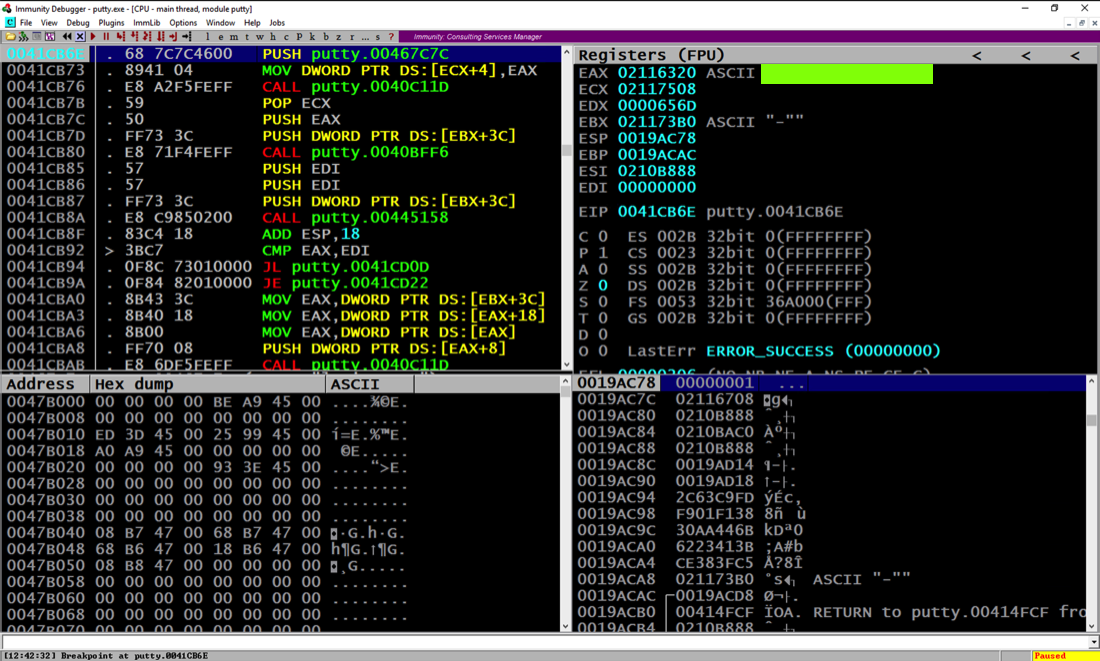 Notice the "Paused" message in the lower right, and the "Breakpoint at putty.0041CB6E" message in the lower left, as shown below.