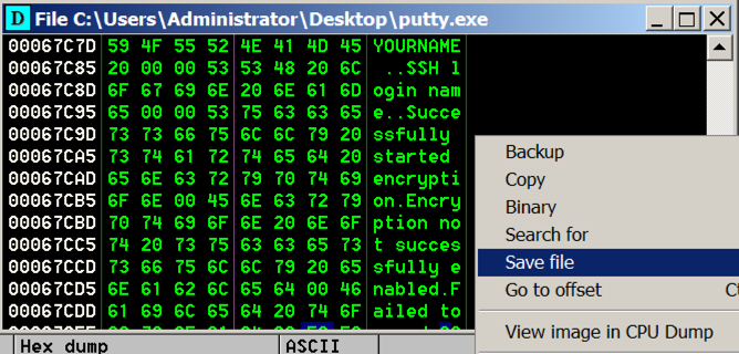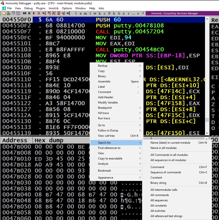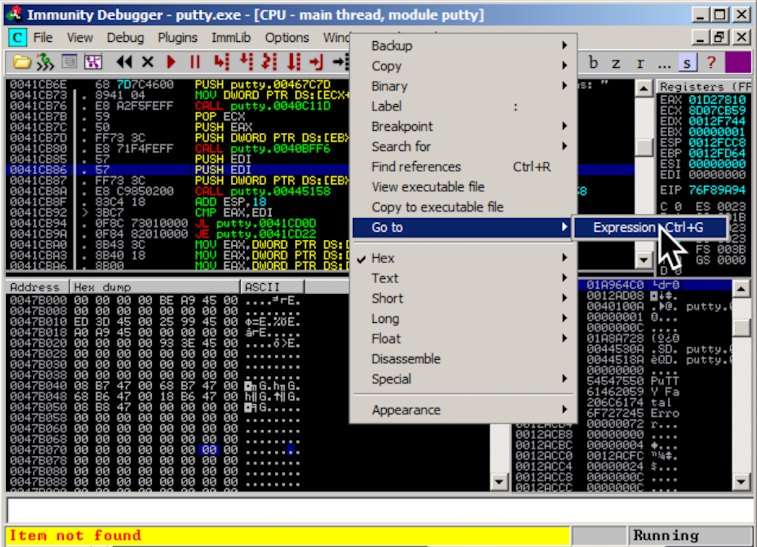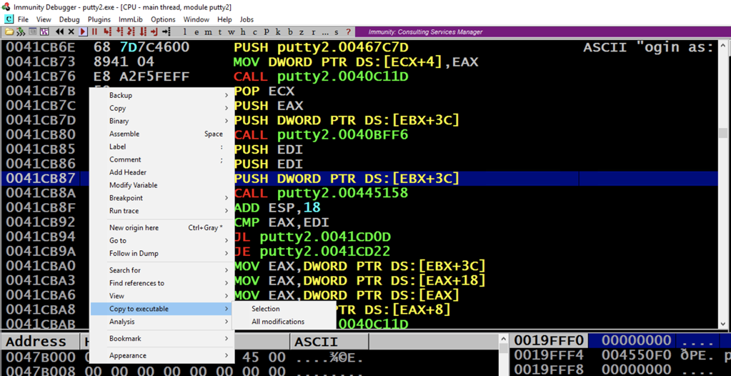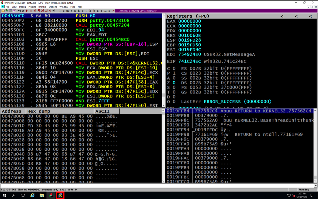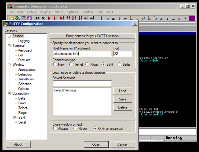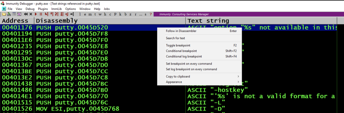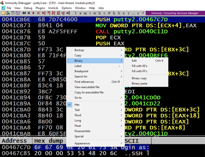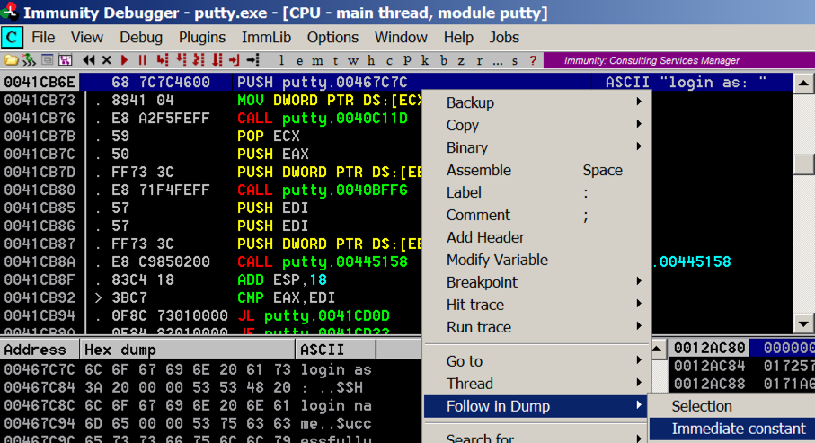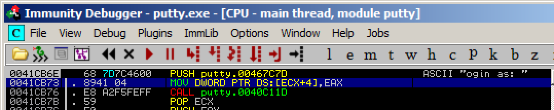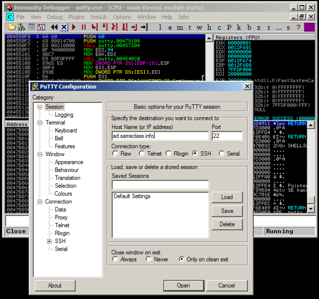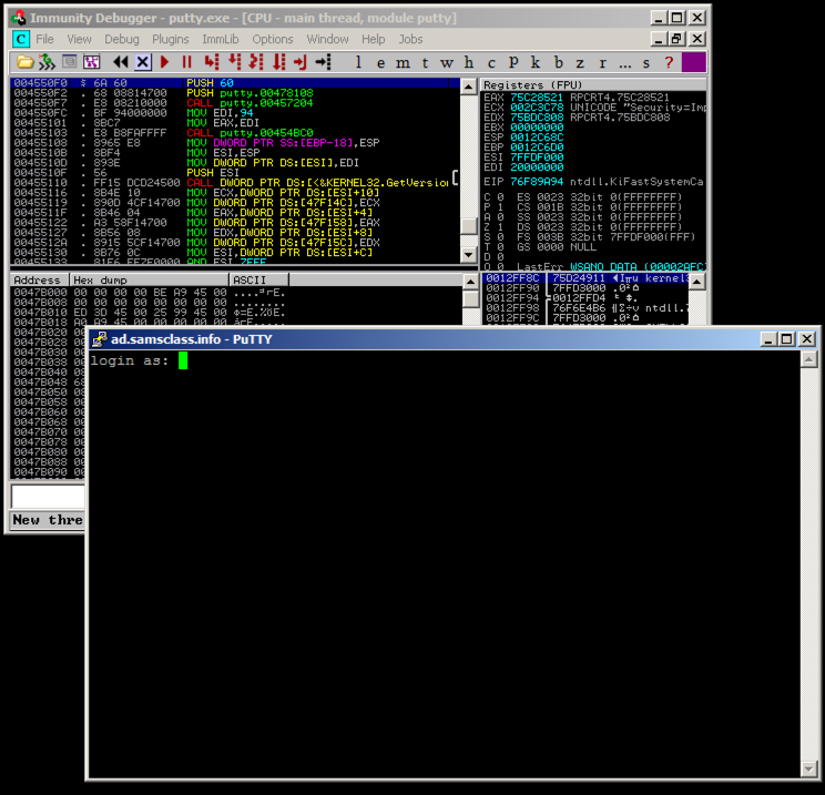 Putty is running, but it's under the control of Immunity, so we can modify its execution.