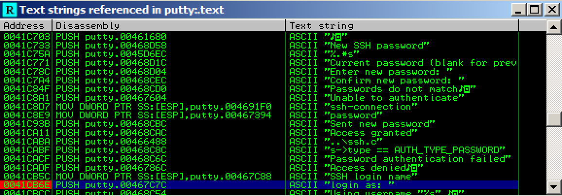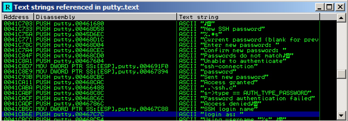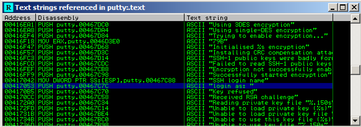 A "Text strings referenced in putty:.text" window opens, showing all the strings in the program.