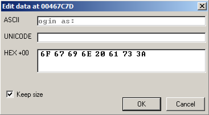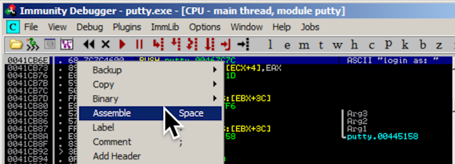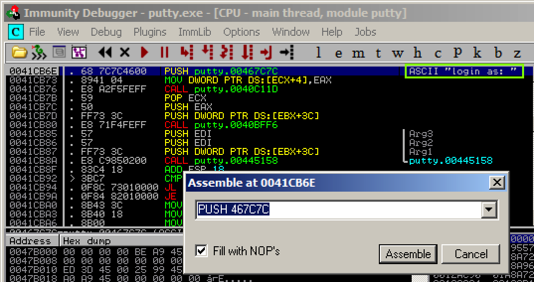 In the "Assemble at 0041CB6E" box, change the last character to D, as shown below. This will move the pointer from the "l" to the "o" in the string "login as: ".