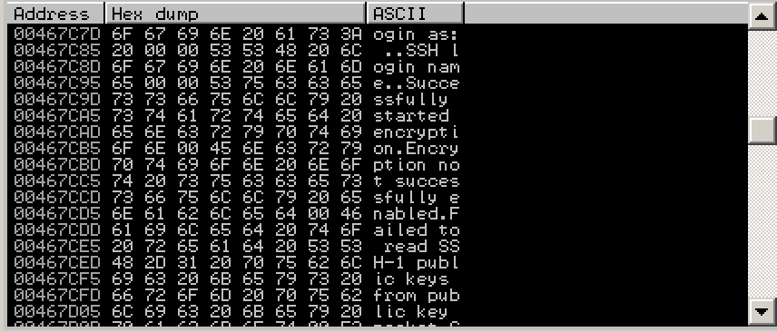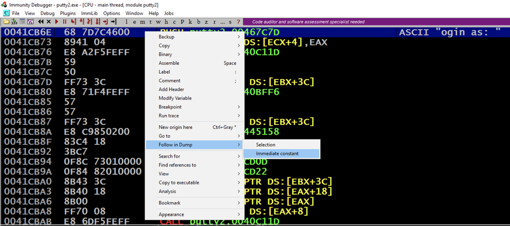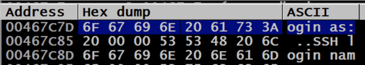 This shows the command at this location. It's a PUSH instruction, placing the address 467C7C onto the stack. That address points to the letter "l" in the ASCII string "login as: ", as shown on the right side of the instruction line, outlined in green in the image below.