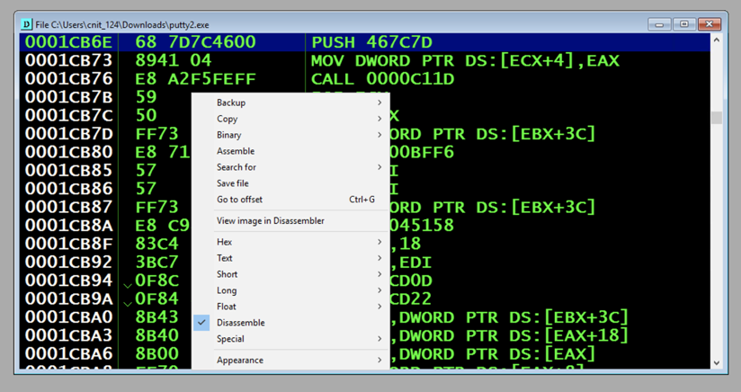 From the Immunity menu bar, click File, Open. Navigate to putty.exe and open it.