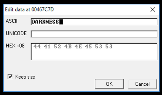 Click in the ASCII box, press Backspace to move back to the start, and overwrite the message with DARKNESS as shown below.
