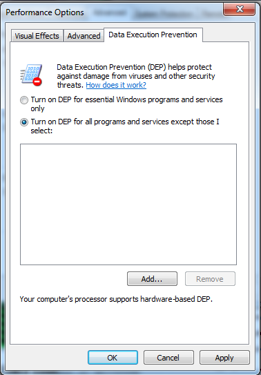 Click "Turn on DEP for all programs and services except those I select", as shown below.